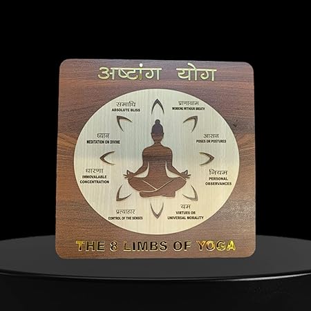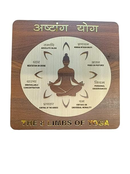 “””This exquisite wooden home decor piece beautifully illustrates the 8 limbs of yoga, a central philosophy in Indian culture. Crafted with precision, it features a serene figure seated in a meditative pose surrounded by inscriptions in Hindi explaining the eight principles – Yama (virtues or universal morality), Niyama (personal observances), Asana (poses or postures), Pranayama (working without breath), Pratyahara (control of the senses), Dharana (immovable concentration), Dhyana (meditation on divine), and Samadhi (absolute bliss). Carved from high-quality wood, this decorative piece emanates warmth and tranquillity, making it a thoughtful addition to any living space. Embrace the timeless wisdom of yoga with this stunning work of art.”””