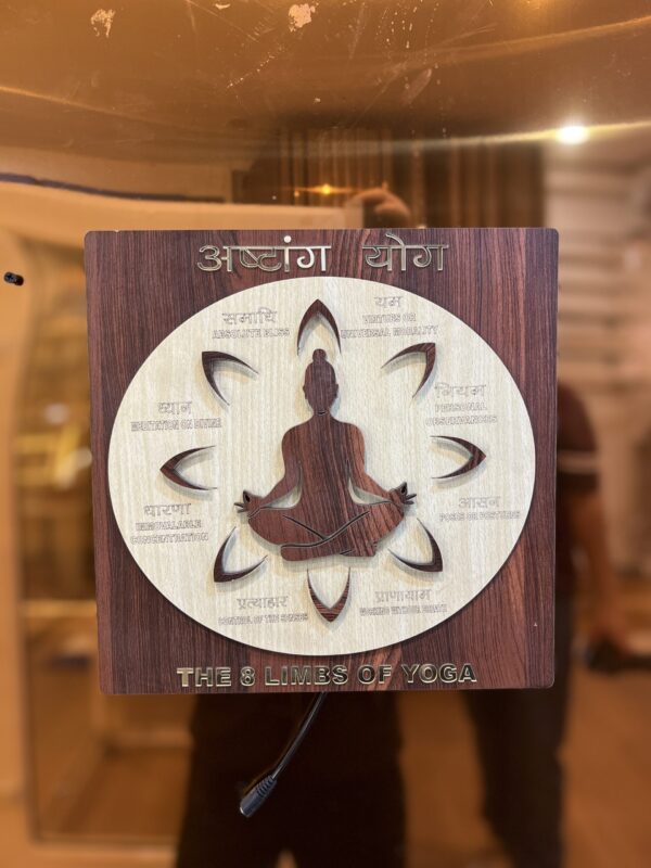 - Artistic Representation: This wooden article showcases Ashtang yog the 8 limbs of yoga through an intricate engraved design on a wooden surface.